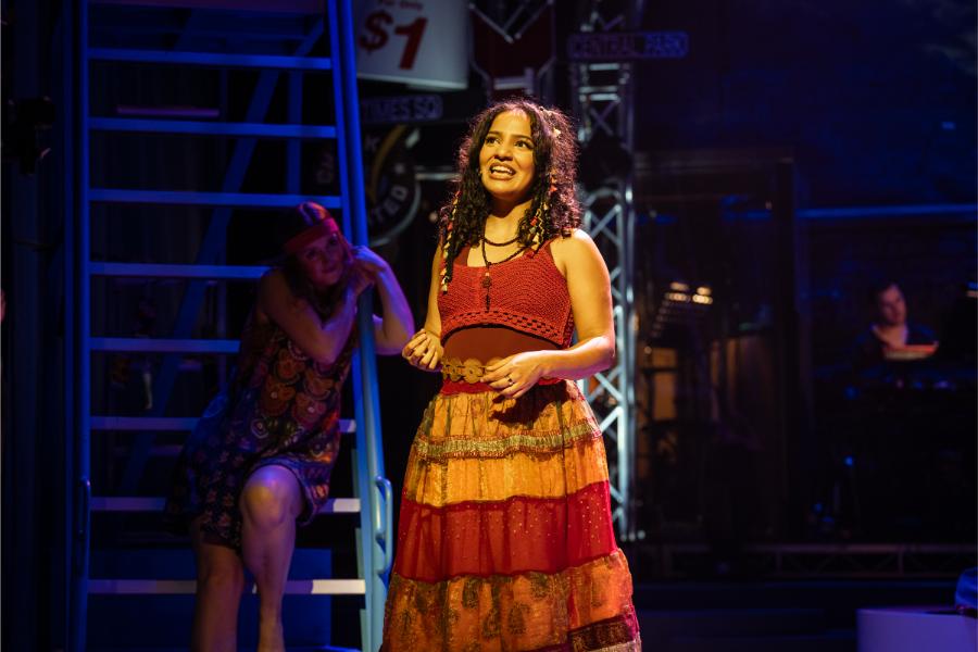 Theatre goers arrived, many dressed in bright colours, flared denim, peace sign necklaces and daisy chains. Famous hits from the era by the likes of Jimi Hendrix, Bob Dylan and Jim Morrison played on the house speakers as the audience members took to their seats. A screen above the stage played iconic black and white news footage of the decade; The Beatles, Martin Luther King’s “I Have A Dream” speech, the JFK inauguration, Woodstock, the Moon Landing, The Cuban Missile Crisis, the anti-Vietnam War and civil rights protests.