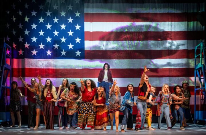 Theatre goers arrived, many dressed in bright colours, flared denim, peace sign necklaces and daisy chains. Famous hits from the era by the likes of Jimi Hendrix, Bob Dylan and Jim Morrison played on the house speakers as the audience members took to their seats. A screen above the stage played iconic black and white news footage of the decade; The Beatles, Martin Luther King’s “I Have A Dream” speech, the JFK inauguration, Woodstock, the Moon Landing, The Cuban Missile Crisis, the anti-Vietnam War and civil rights protests.