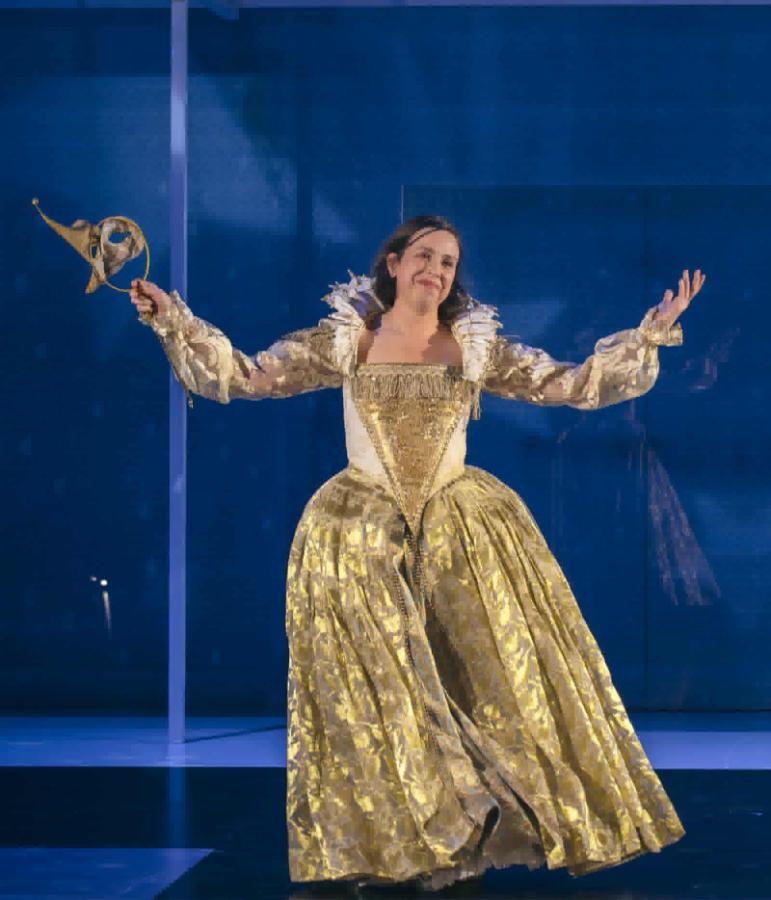 The play is made up of eight actors, most of whom also play multiple characters with different accents and costumes (20 characters in total). Leading the way was Alison Bell as Beatrice and Fayssal Bazzi as Benedick. Both had a strong stage presence and excellent chemistry together. By far, the main standout was Julie Forsyth, who was both memorable and often had the biggest laughs on opening night in every scene she was in. Julie played Ursula, one of Hero’s two gentlewomen who helped orchestrate Beatrice into falling in love with Benedick. Julie also portray Dogberry, the clownish, self-important chief constable of Messina, whose humour comes from his misuse of language, as he uses big words incorrectly while trying to impress others. The costume design by Karine Larché, was an interesting choice; a hybrid of outfits of Shakespeare’s time to the present day.