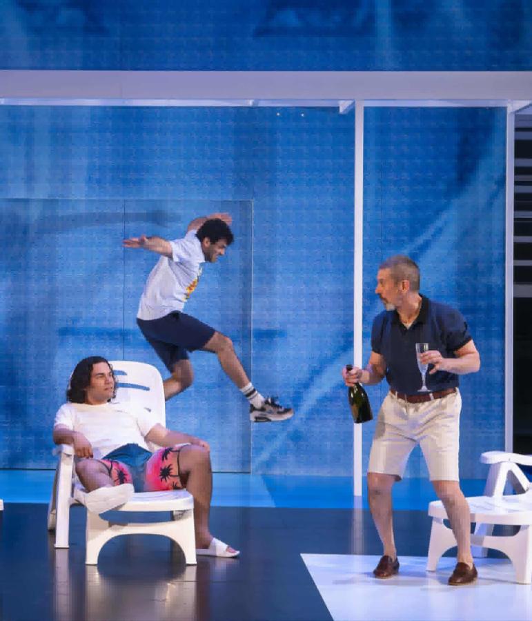 It is a Wednesday evening at The Summer at The Southbank Theatre. As I make my way to my seat, the first thing that I noticed is the unique set design. In the very middle of the stage sits a large two-storey frontage with a second-storey balcony. The entire façade is a blue-tinged design of Pamela Anderson’s face that was famously attached to the front of the St Kilda home of The Footy Show co-host, Sam Newman. It already sets the theme and humour of the show. The curtains legs are also removed, exposing both wings of the stage. Costume racks, props, changing areas, technical staff, equipment, and other waiting cast members are in full view.
