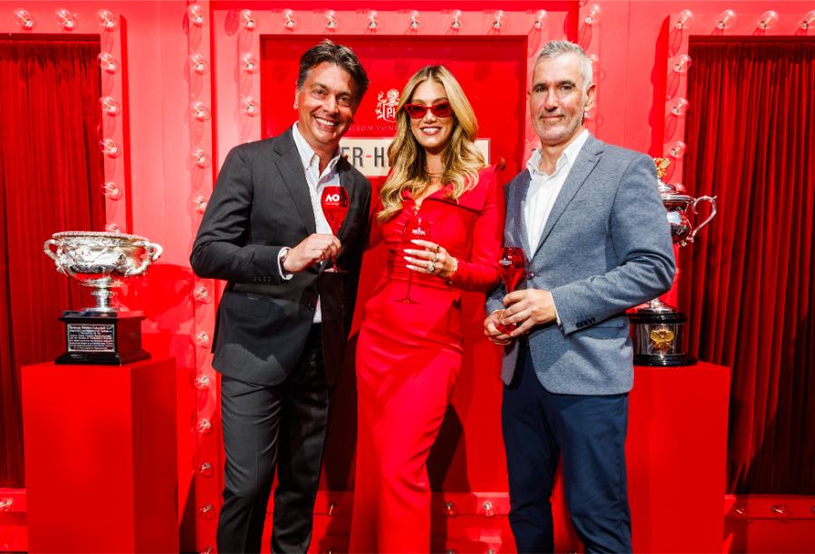 Delta Goodrem a vision in Red at the Australian Open, Celebrating Tennis and Champagne with Piper Heidsieck.