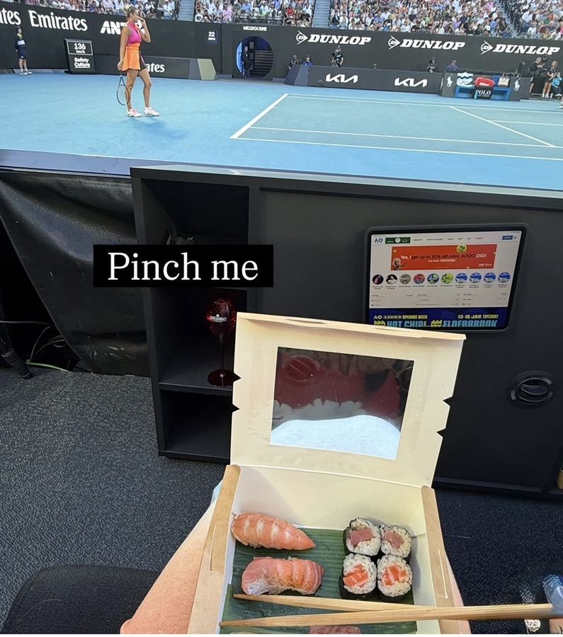 Accompanied by her husband, Chris Judd, the couple was all smiles as they prepared for a memorable date night at the iconic Rod Laver Arena. With on-court seats that offered a front-row experience, they were set to soak in the atmosphere of the tournament. “I’m so excited to experience the AO with Piper and enjoy some champagne and sushi during the match!” Bec shared on her socials.