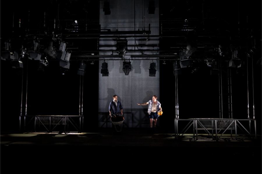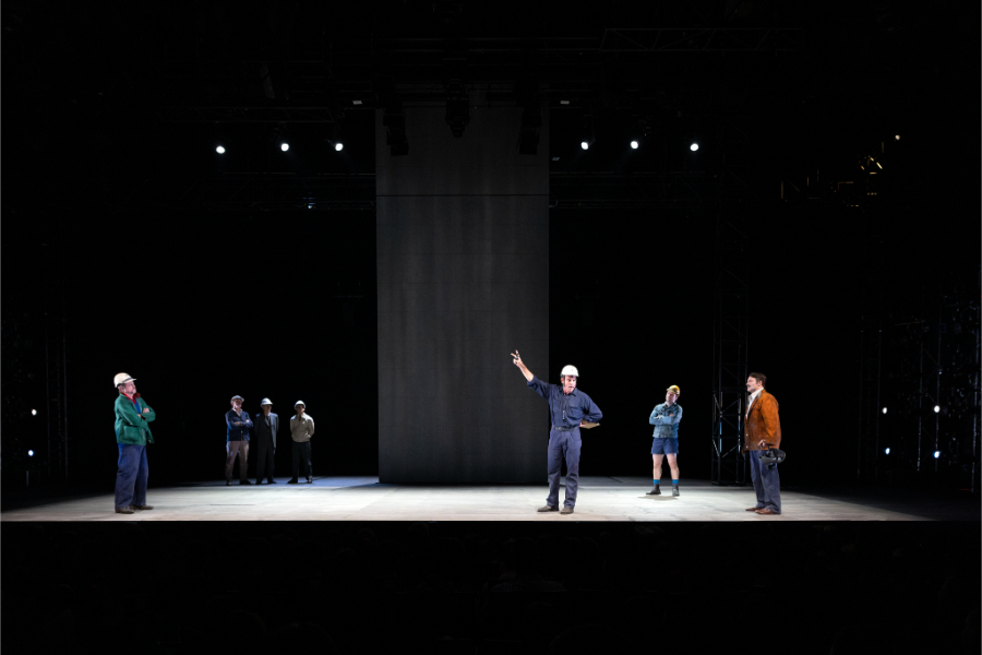 As I make my way to my seat, the first thing that I noticed is the unique set design. On either side of the stage, are lighting rigs that later rise, electrical sparks are flying down from the ceiling, there’s machinery noise and in the very middle, a towering grey concrete pylon. Six workers then take to the stage, speaking to each other and often breaking the fourth wall, speaking to the audience, drawing us into the world of the West Gate Bridge and the early 1970s working class Melbourne.